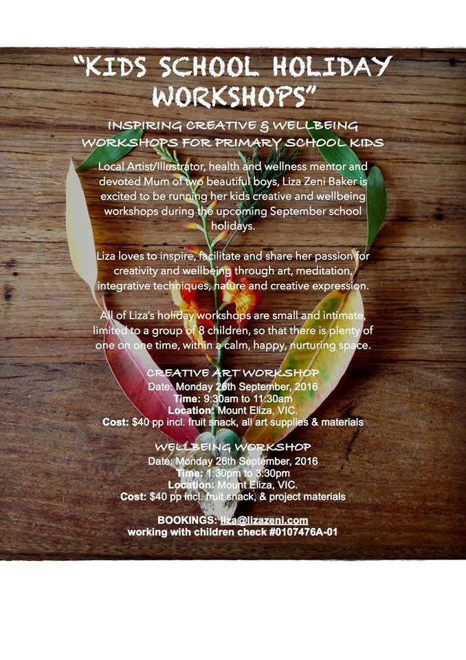 Talented Mount Eliza local, Liza Baker, is running 'Kids School Holiday Creative and Wellbeing Workshops'.